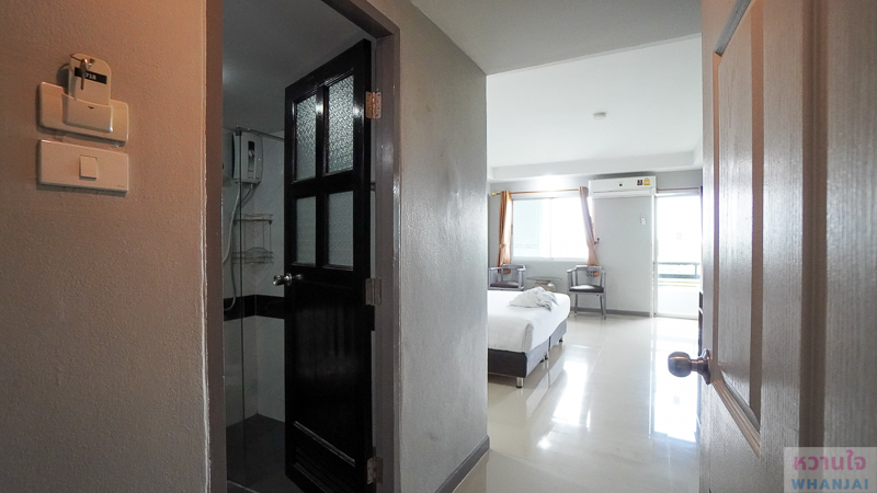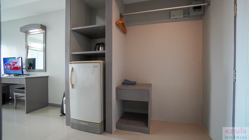ด้านหน้าทางเข้าจะมีตู้เสื้อผ้า ไม้แขวนผ้า ลิ้นชักเก็บของ ตู้เย็น พร้อมน้ำดื่ม กาน้ำร้อน และกาแฟซองให้