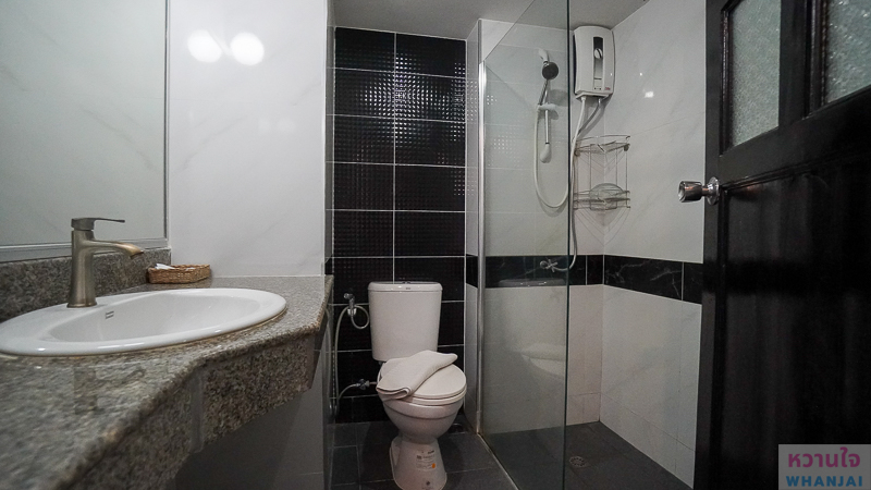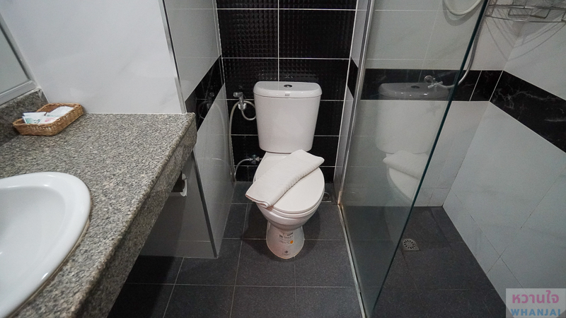 ตรงข้ามจะเป็นห้องน้ำ แยกส่วนแห้งและส่วนอาบน้ำให้เรียบร้อย