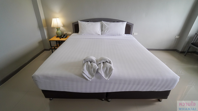 ในห้องได้เตียงนอน King Size โต๊ะหัวเตียง ปลั๊กไฟ โคมไฟ พร้อมผ้าเช็ดตัว 2 ผืน