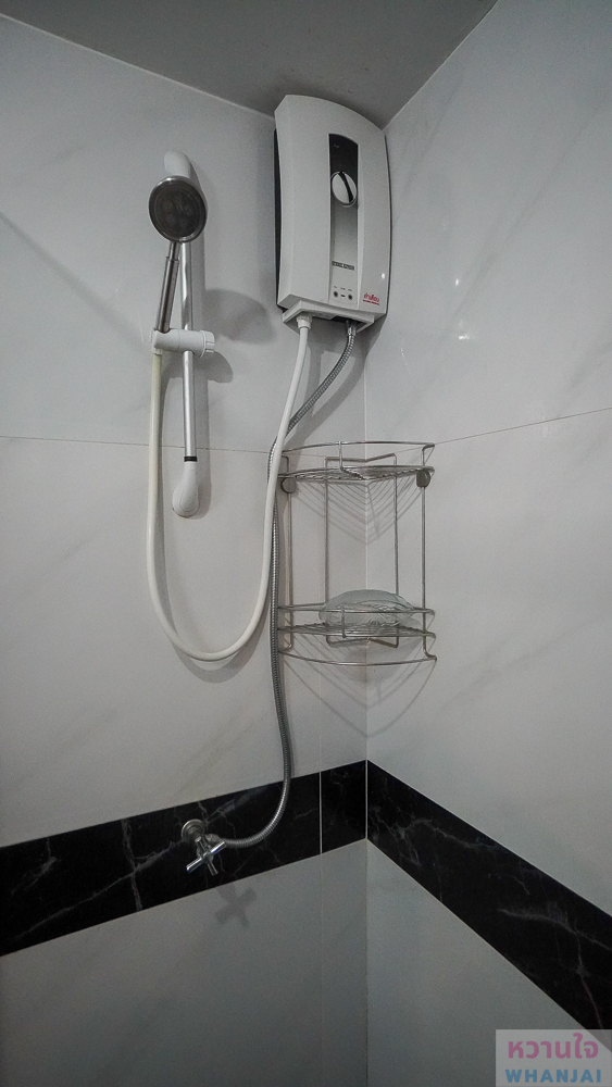 ส่วนอาบน้ำมีฉากกั้นไว้ให้ ด้านในมีผักบัวและเครื่องทำน้ำร้อนให้ใช้งาน