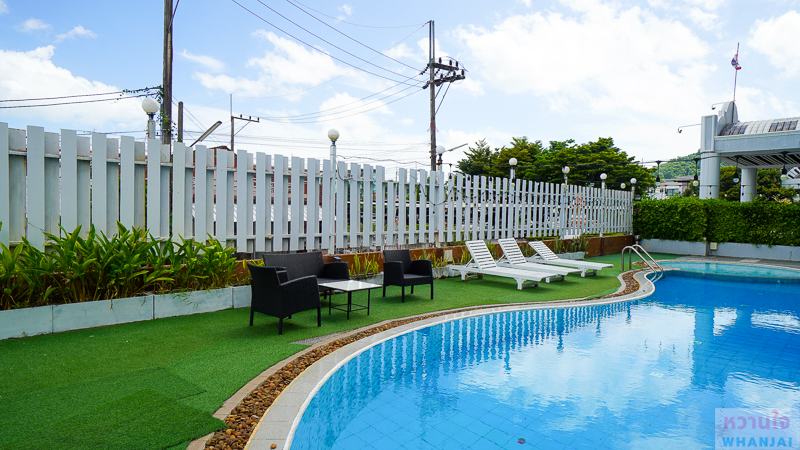 ริมสระว่ายน้ำจะมีชุดโตีะเก้าอี้สนาม และเก้าอี้อาบแดดจัดเตรียมไว้ให้หลายที่นั่ง