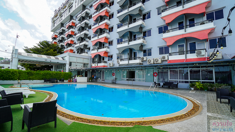 จากสระว่ายน้ำมองขึ้นไปเห็นอาคารห้องพักของโรงแรม